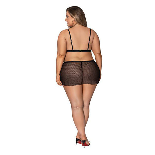 From the Exposed by Magic Silk collection, this style includes: a triangle bralette featuring a strappy triangle design in front, adjustable shoulder straps with black sliders, swan hook closure in the back, and a matching g-string with an attached ruffle...