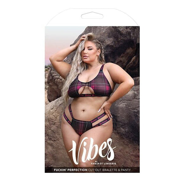 Cut-out Plaid Mesh Bralette & Matching Caged Panty with "Fuckin' Perfection" Elastic. Materials: 80% Nylon, 20% Spandex. Size: S/M: Cup: B/C Bust: 32"-36" Waist: 26"-28" Hips: 33"-38" M/L: Cup: C/D Bust: 34"-38" Waist: 28"-31" Hips: 36"-40" L/XL: Cup: D/DD Bust: 36"-40" Waist: 31"-34"...