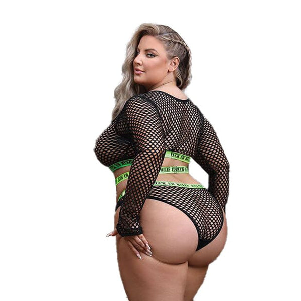 Long sleeve Fishnet Crop Top, Matching Panty with UV Reactive "Fuck Ur Rules" Elastic & 1 Pair of Cross Pasties. Materials: 80% Nylon, 20% Spandex. Size: S/M: Cup: B/C Bust: 32"-36" Waist: 26"-28" Hips: 33"-38" M/L: Cup: C/D Bust: 34"-38" Waist: 28"-31"...