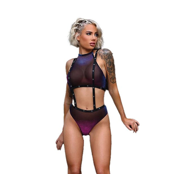 Iridescent Mesh Halter Top & Suspender Bottoms with UV Reactive Star Printed Elastic. Materials: 80% Nylon, 20% Spandex. Size: S/M: Cup: B/C Bust: 32"-36" Waist: 26"-28" Hips: 33"-38" M/L: Cup: C/D Bust: 34"-38" Waist: 28"-31" Hips: 36"-40" L/XL: Cup: D/DD Bust: 36"-40" Waist:...